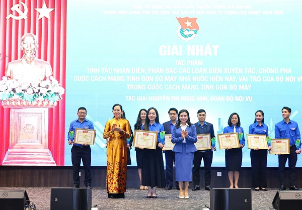 Các tác giả, nhóm tác giả đạt giải tại Cuộc thi sáng tác các sản phẩm truyền thông với chủ đề “Thanh niên Chính phủ với công tác bảo vệ nền tảng tư tưởng của Đảng” năm 2025. Ảnh: Minh Đức